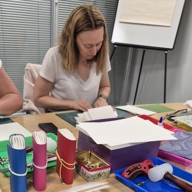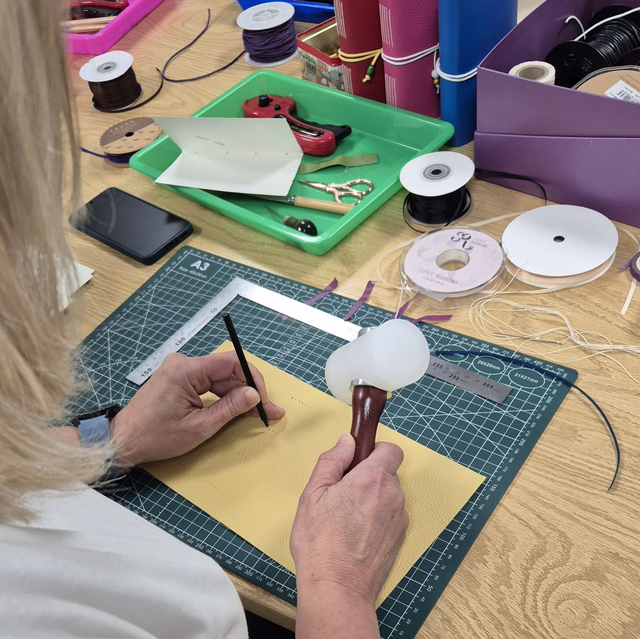 Join Sharon from Mallory Journals for a creative morning learning to make a beautiful Hand Bound A6 Leather Journal. Sharon uses Italian Leathers and stunning papers bonded to the covers to make her luxury Journals.